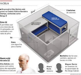 Na cela de 15 metros quadrados, com dois beliches, o empresário ocupa uma das camas superiores. Suas roupas estão numa sacola de plástico. O travesseiro que trouxe dos Estados Unidos fica sobre sua cama.