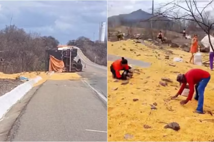 Carreta carregada com milho tomba em rodovia do Ceará; população saqueia carga