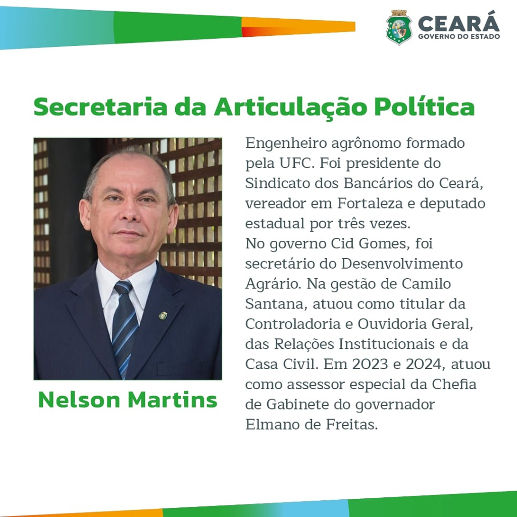 “Agradeço aos profissionais que deixaram os cargos por toda dedicação até aqui, e desejo muito sucesso aos novos titulares das secretarias e órgãos estaduais. Vamos trabalhar muito para que nosso Ceará avance cada vez mais, garantindo mais oportunidades para os irmãos e irmãs cearenses”, finaliza Elmano ao anunciar os nomes.