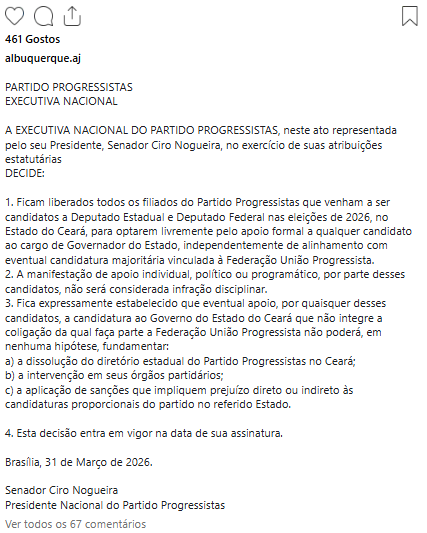 “Ficam liberados todos os filiados do partido Progressistas que venham a ser candidatos a deputado estadual e deputado federal nas eleições de 2026, no Estado do Ceará, para optarem livremente pelo apoio formal a qualquer candidato ao cargo de governador do Estado, independentemente de alinhamento com eventual candidatura majoritária vinculada à federação União Progressista”, destaca trecho da decisão.