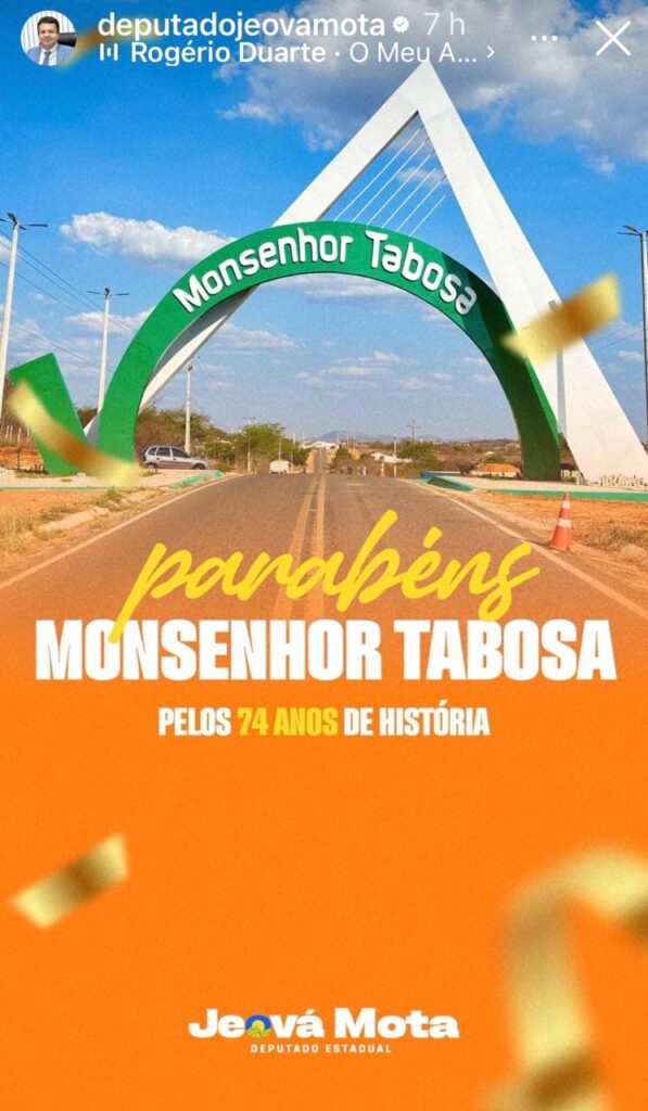 “Parabéns, Monsenhor Tabosa, pelos seus 74 anos de história, força e conquistas. Seguiremos juntos, trabalhando para que este município continue crescendo e sendo orgulho para toda a região.”