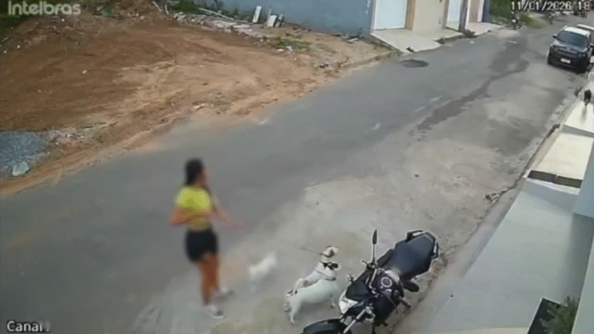 Imagens de câmeras de segurança mostram que a mulher caminhava com três cachorros de pequeno porte, na rua, levando o trio na coleira, quando os animais são atacados pelo pitbull, que parece vir de uma casa próximo.