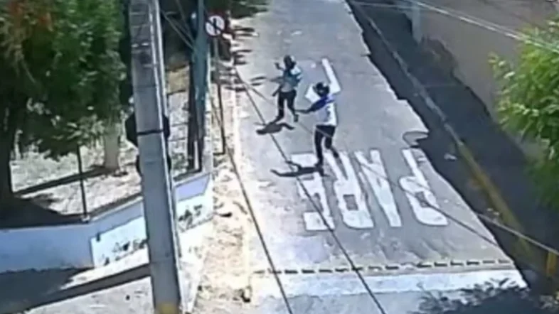 Nas imagens, é possível ver que, imediatamente, um dos jovens cai após ser atingido, enquanto outros correm para longe. Os criminosos também deixam o local correndo e fogem na moto. O ataque deixou estudantes em pânico, muitos deles tentando fugir da unidade de ensino.